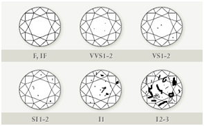 IGI grading reports show plotted diagrams of clarity characteristics. There are two types of clarity characteristics: inclusions and blemishes. In order to grade the clarity of a diamond, it is necessary to observe the number and nature of external and internal characteristics of the stone, as well as their size and position. The difference is based on their locations: inclusions are enclosed within a diamond, while blemishes are external characteristics.